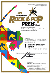 Platz 1 für den besten Keyboarder (Sven Selle) Platz 1 für den besten Gitarristen (Hörbie Schmidt)Platz 1 für die beste Cover-/Revivalband (Hörbie Schmidt Band – Tightrope) Platz 1 für das beste traditionelle Blues-Album (For Our Heroes – Own Style) Gewinnerin Deutscher Singerpreis ( Lili Czuya)