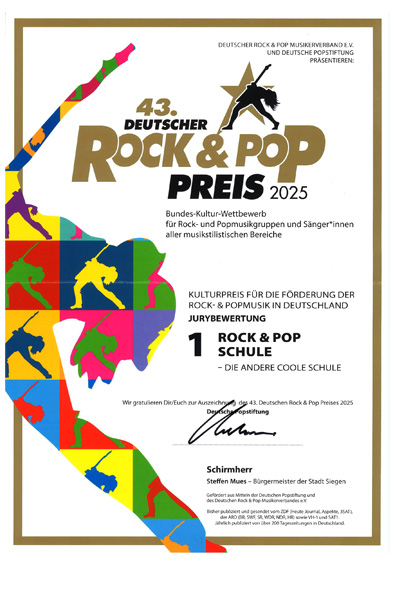 beim diesjährigen Deutschen Rock & Pop Preis der Deutschen Popstiftung hat die Rock und Pop Schule in der Klassifikation „Kulturpreis für die Förderung der Rock- und Popmusik in Deutschland“ den 1. Platz belegt.